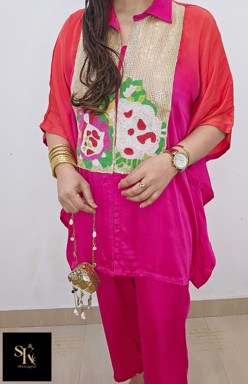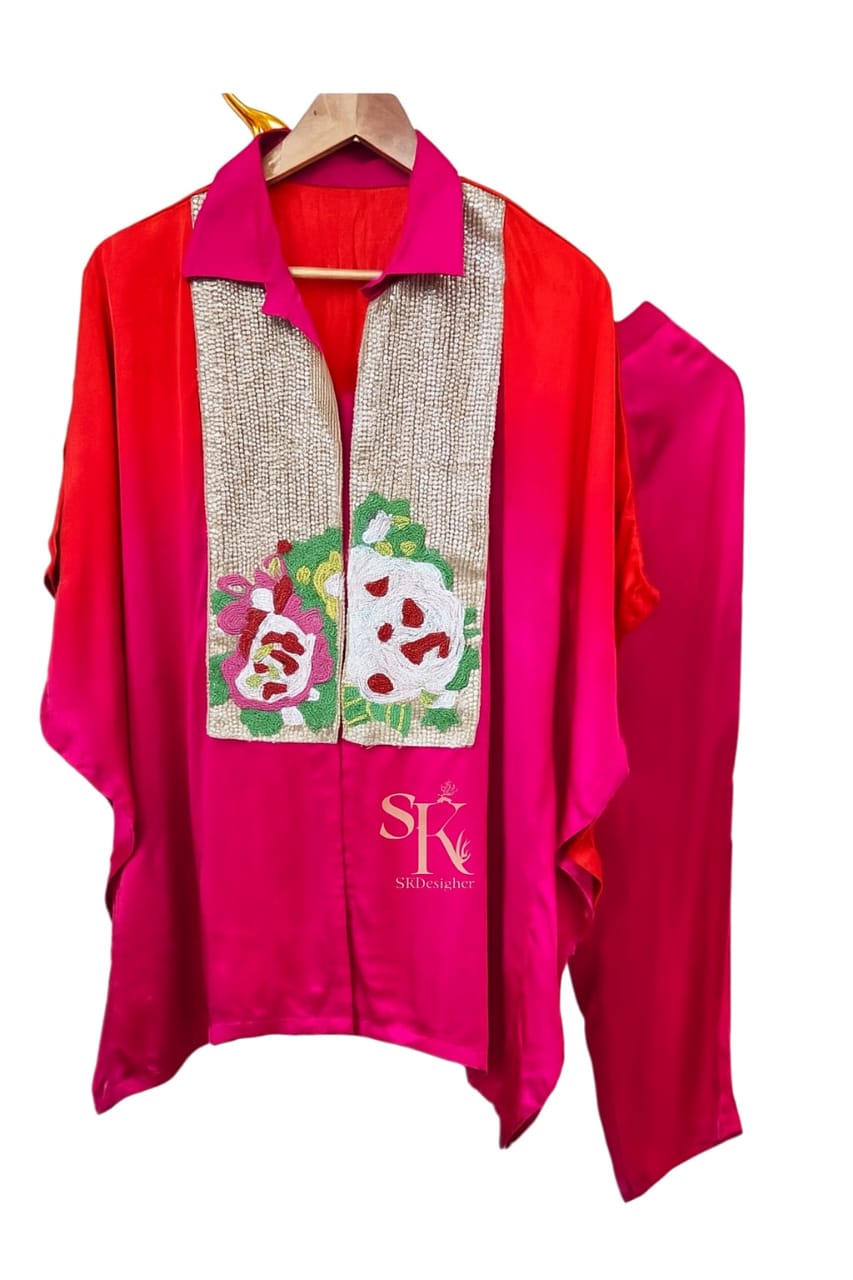 Premium shaded pure crepe satin co-ord set featuring rich hand-embellished yoke detailing — a luxe fusion look perfect for parties, cocktail evenings & premium festive wear.