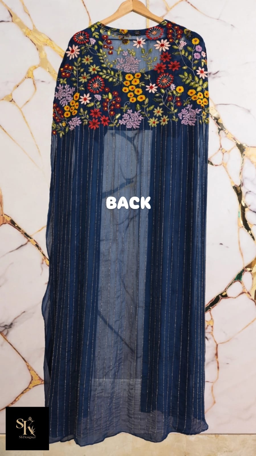 Turn heads with our Pure Chinnon Crop Top & Drape Skirt Set, layered with a long pure chinnon cape jacket featuring heavy embroidery and shimmering cutdana work.