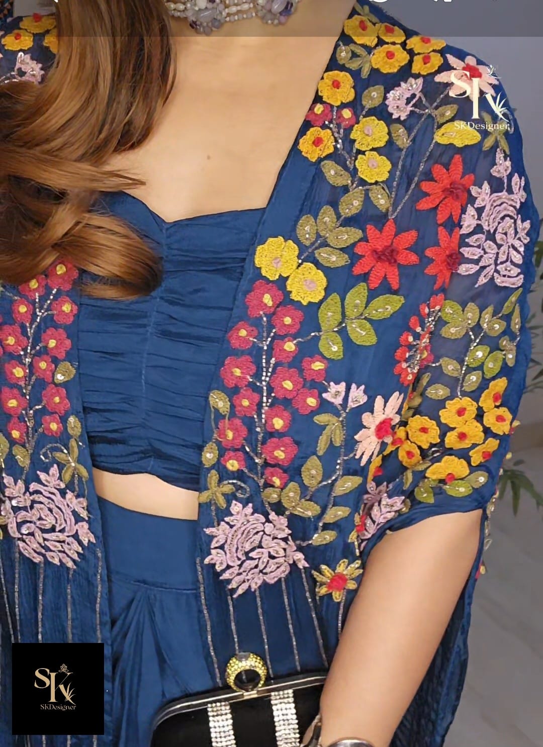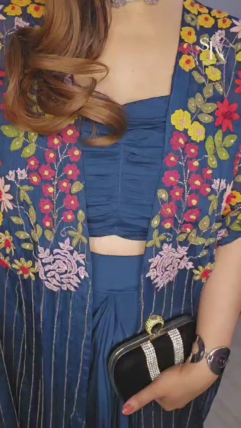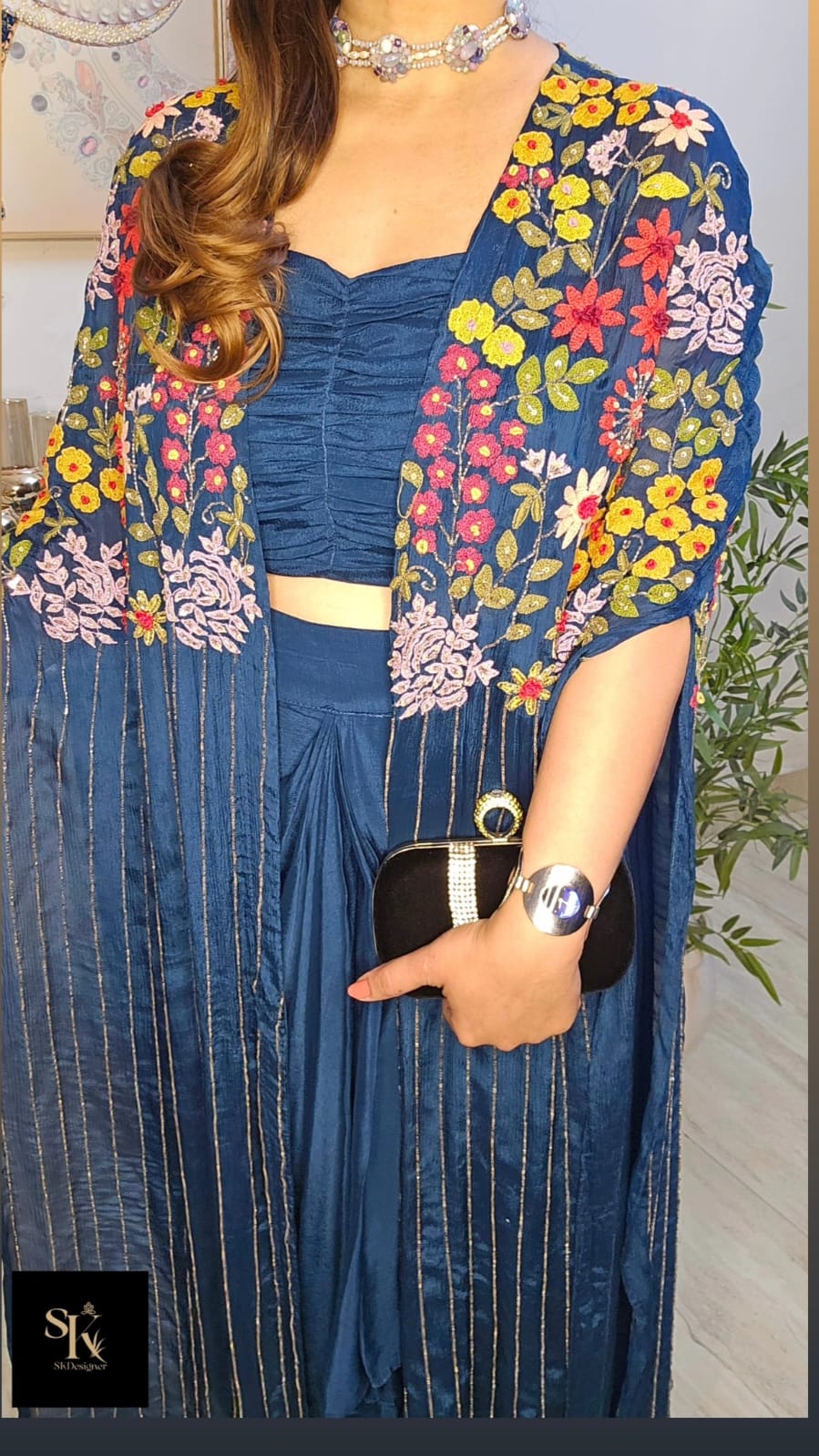 The crop top and drape skirt create a sleek, flattering base, while the cape jacket adds drama, movement, and couture-level elegance. Crafted in premium chinnon fabric, this ensemble offers graceful flow with a rich party-wear finish—perfect for cocktail nights, wedding celebrations, festive soirées, and upscale events.