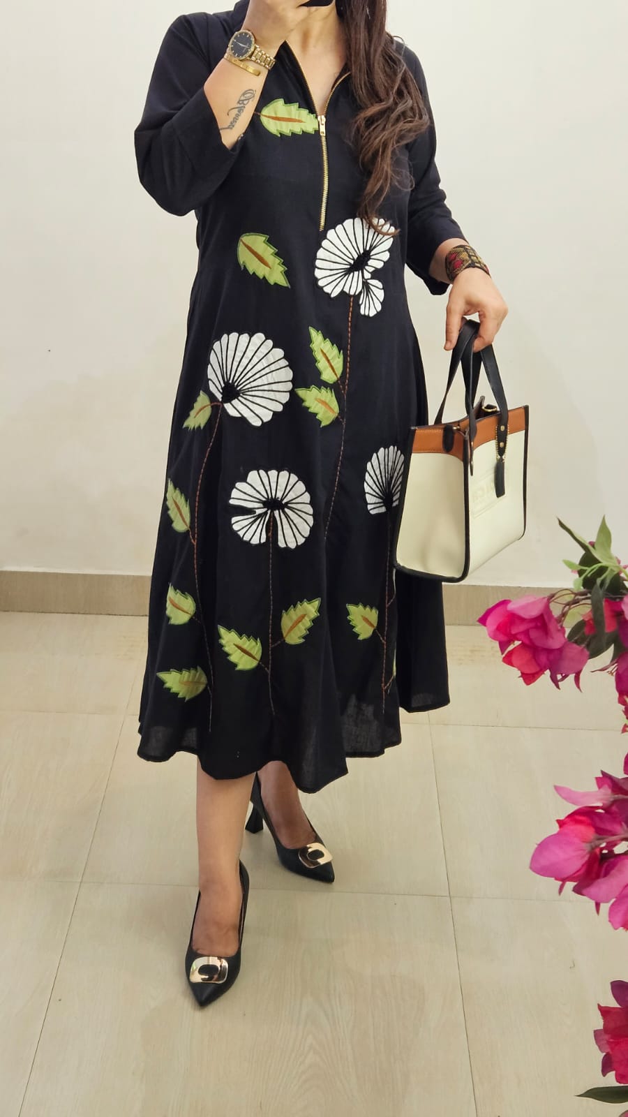 Designed for the modern woman who loves comfort with a touch of statement detailing, this dress features intricate floral & leaf appliqué work that adds luxe charm. The front zipper makes it chic, functional, and perfect for day-to-night styling.