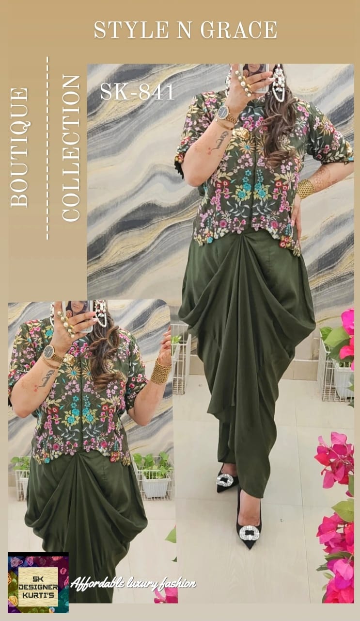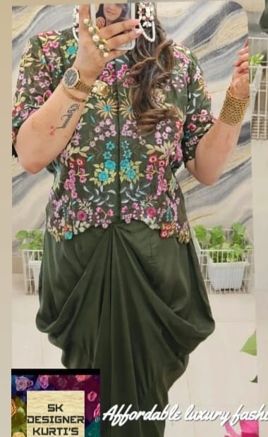 Turn heads at any special occasion with our Pure Dola Silk Designer Party Ensemble. This luxurious set features a heavily embroidered blouse, meticulously crafted with intricate work on both the front and back, exuding opulence from every angle. Paired with a sleek drape skirt in pure dola silk, it offers a perfect balance of modern style and timeless elegance—ideal for cocktail parties, receptions, and high-end gatherings.