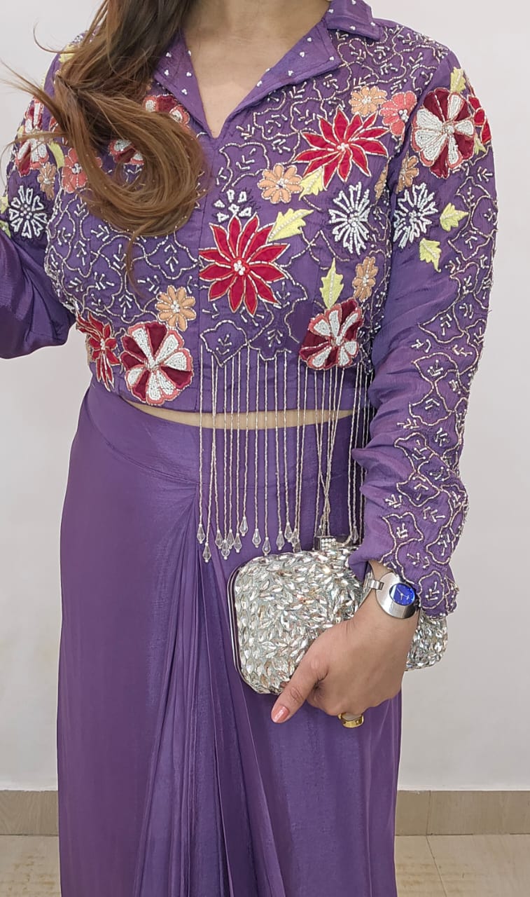 A stunning fusion of elegance and high-fashion, this set comes in rich Pure Chinnon with a short embellished crop jacket that instantly turns heads. The designer drape skirt adds flow, grace, and pure glamour — the perfect boutique luxe look!