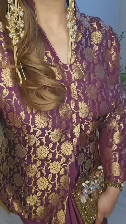 This SK DESIGNER Imperial Brocade Wedding Drape Set blends traditional zari weaving with a contemporary draped silhouette, giving you a look that’s effortlessly regal and high-fashion.