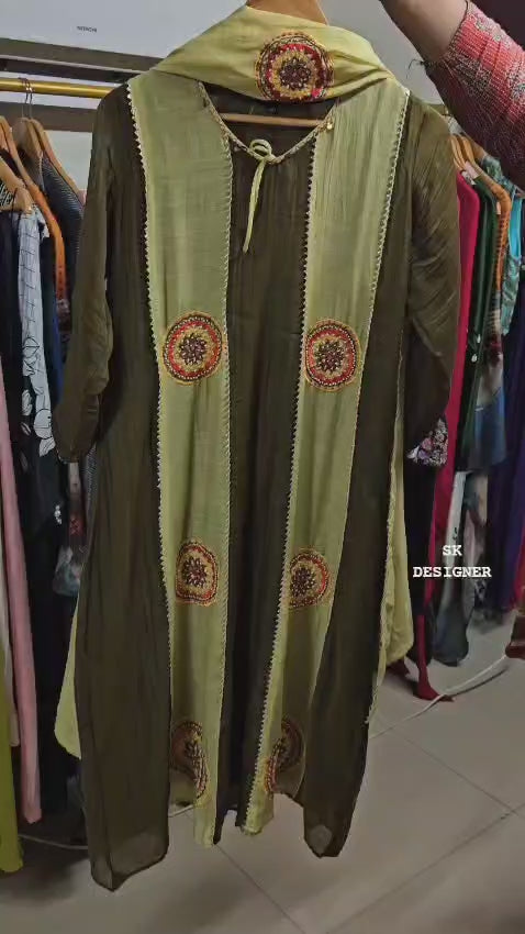 Step into timeless luxury with this Pure Mul Chanderi three-piece set.